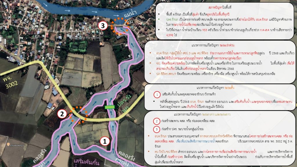 ดร.สุรสีห์ เปิดเผยว่า จากอิทธิพลของพายุ “วิภา” ต่อเนื่องด้วย พายุ “คาจิกิ” ในช่วงที่ผ่านมา ได้ส่งผลกระทบอย่างมากต่อพื้นที่ลุ่มน้ำยม – น่าน โดยเฉพาะลุ่มน้ำยมที่มีปริมาณน้ำจำนวนมาก นายประเสริฐ จันทรรวงทอง รองนายกรัฐมนตรี และรัฐมนตรีว่าการกระทรวงดิจิทัลเพื่อเศรษฐกิจและสังคม ในฐานะประธานกรรมการทรัพยากรน้ำแห่งชาติ (กนช.) จึงได้มอบหมายให้ สทนช. ลงพื้นที่หารือแนวทางการบริหารจัดการน้ำเพื่อคลี่คลายสถานการณ์อย่างเร่งด่วน โดยในวันนี้กรมอุตุนิยมวิทยาและสถาบันสารสนเทศทรัพยากรน้ำ (องค์การมหาชน) (สสน.) รายงานว่า พายุโซนร้อนบริเวณทะเลจีนใต้ตอนกลางจะเคลื่อนขึ้นฝั่งประเทศเวียดนามในช่วงเย็นวันนี้ ก่อนจะอ่อนกำลังลงเป็นหย่อมความกดอากาศต่ำพัดปกคลุมประเทศไทย ส่งผลให้ตั้งแต่วันที่ 31 สิงหาคม จะมีฝนตกเพิ่มขึ้นในภาคตะวันออกเฉียงเหนือ ภาคเหนือตอนล่างและบางส่วนของภาคเหนือตอนบน นอกจากนี้ คาดว่าในเดือนกันยายนจะยังคงมีฝนตกชุกหนาแน่นต่อเนื่องจากร่องมรสุมและมรสุมตะวันตกเฉียงใต้ และยังมีโอกาสที่จะเกิดพายุหมุนเขตร้อนเคลื่อนตัวเข้าสู่ประเทศไทยตอนบนได้ ที่ประชุมจึงได้พิจารณาแนวทางเร่งระบายน้ำออกจากลุ่มน้ำยมภายใน 2 วันนี้ โดยกรมชลประทานจะเพิ่มการระบายน้ำผ่านประตูระบายน้ำคลองหกบาท จาก 300 ลูกบาศก์เมตร (ลบ.ม.) ต่อวินาที เป็น 380 ลบ.ม. ต่อวินาที โดยปริมาณน้ำจะไหลผ่านไปทางแม่น้ำยมสายเก่าประมาณ 170 ลบ.ม. ต่อวินาที และคลองยม – น่าน 210 ลบ.ม. ต่อวินาที พร้อมทั้งได้เพิ่มการติดตั้งเครื่องสูบน้ำที่บริเวณประตูระบายน้ำบางแก้ว เพื่อเร่งระบายน้ำจากแม่น้ำยมสายเก่า โดยทั้งหมดจะไหลรวมลงสู่แม่น้ำน่านต่อไป