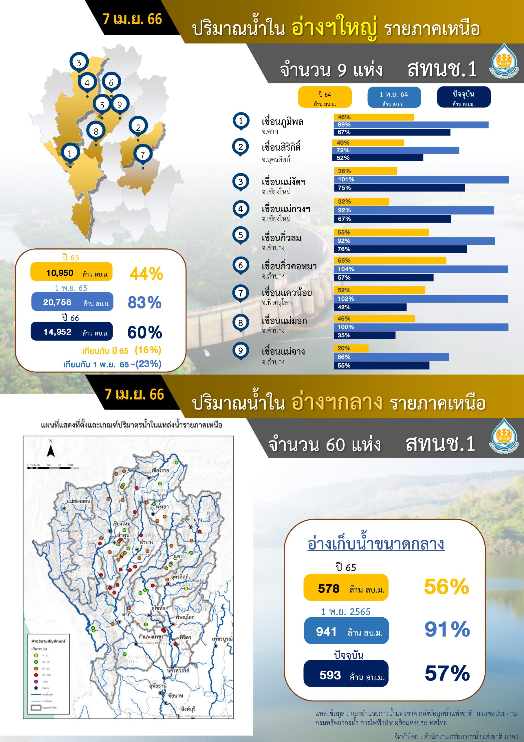 สถานการณ์น้ำฤดูแล้งปี 2566 ในแหล่งน้ำขนาดใหญ่และขนาดกลาง ลุ่มน้ำปิงตอนบน ประจำวันที่ 7 เมษายน 2566