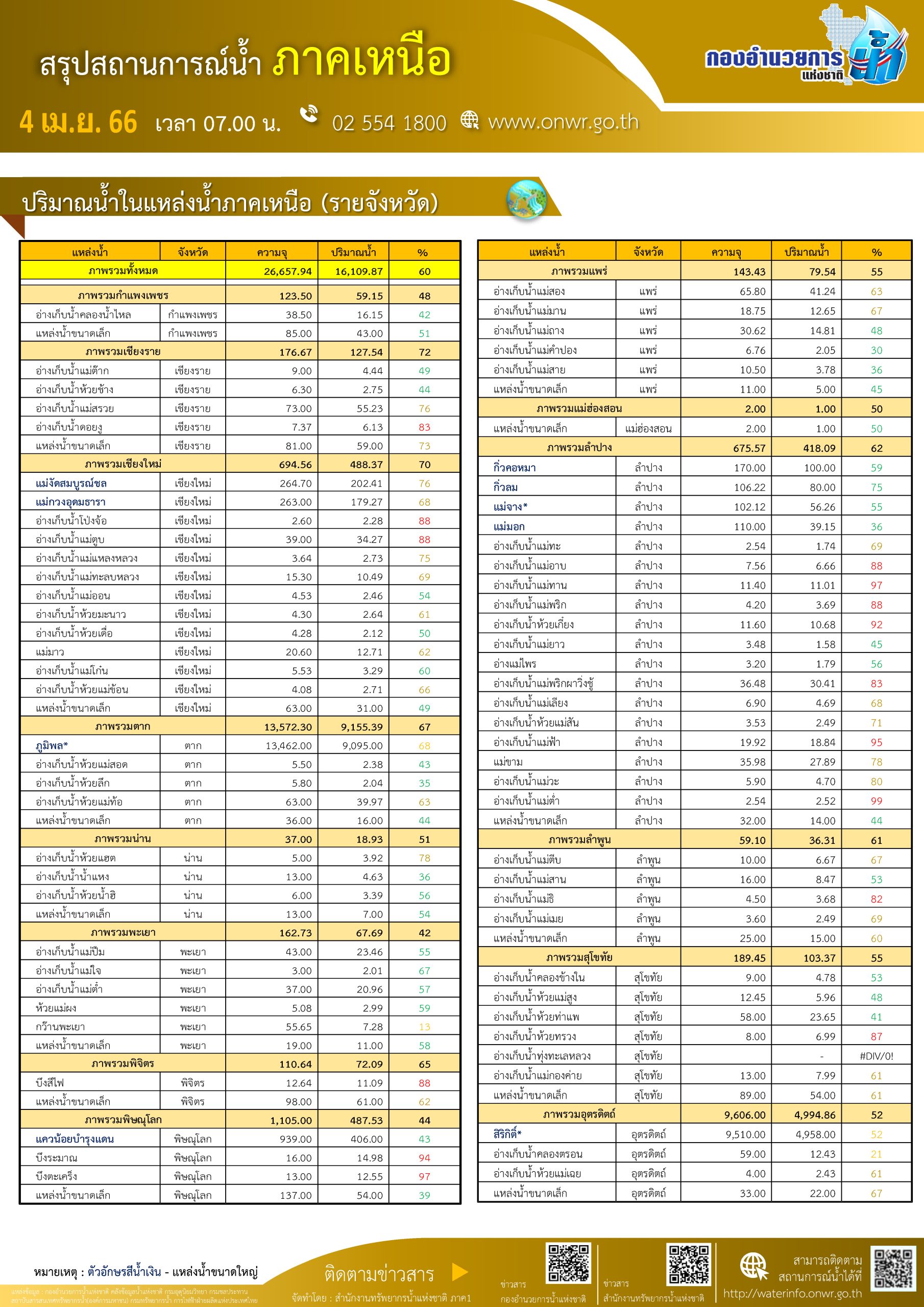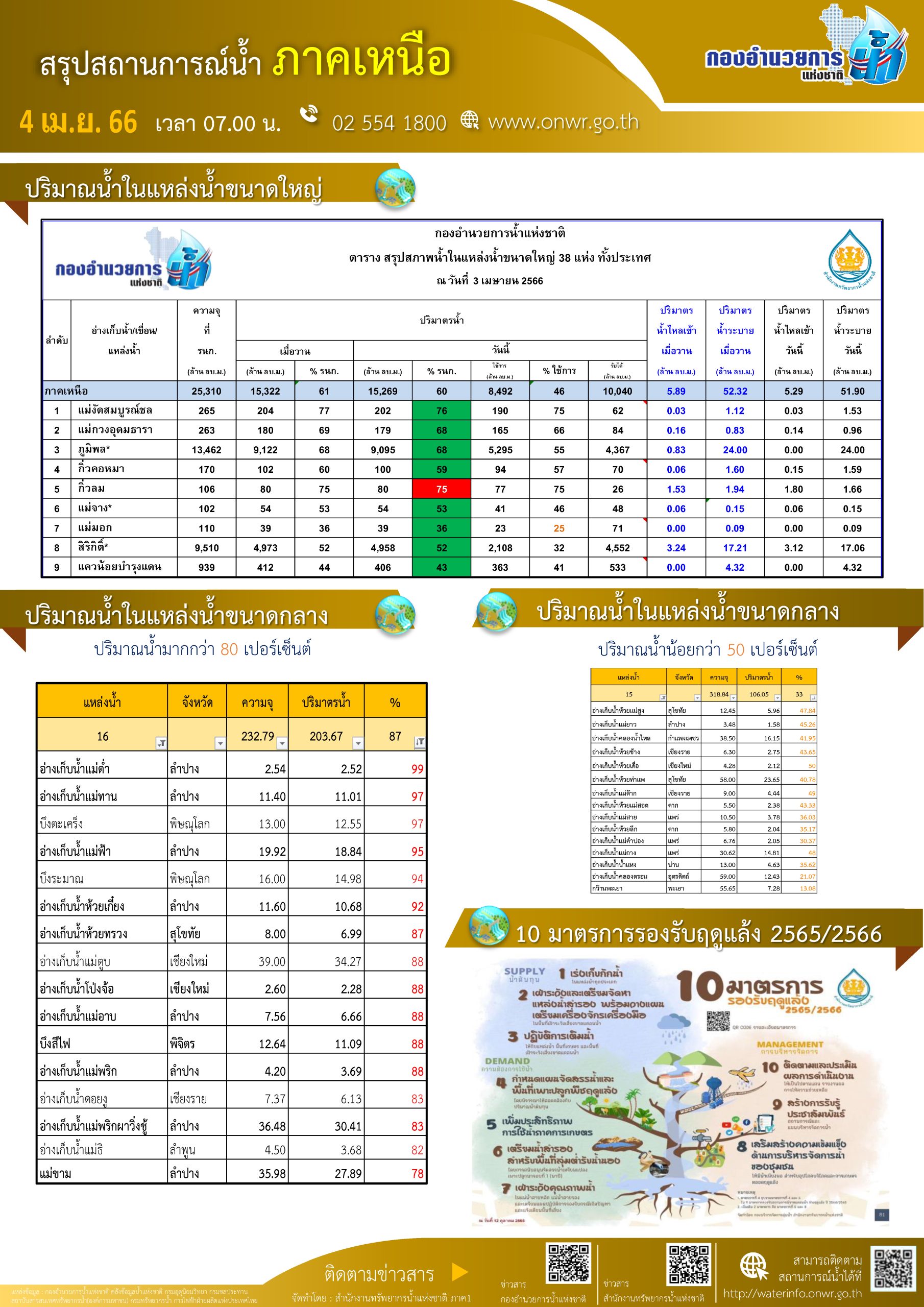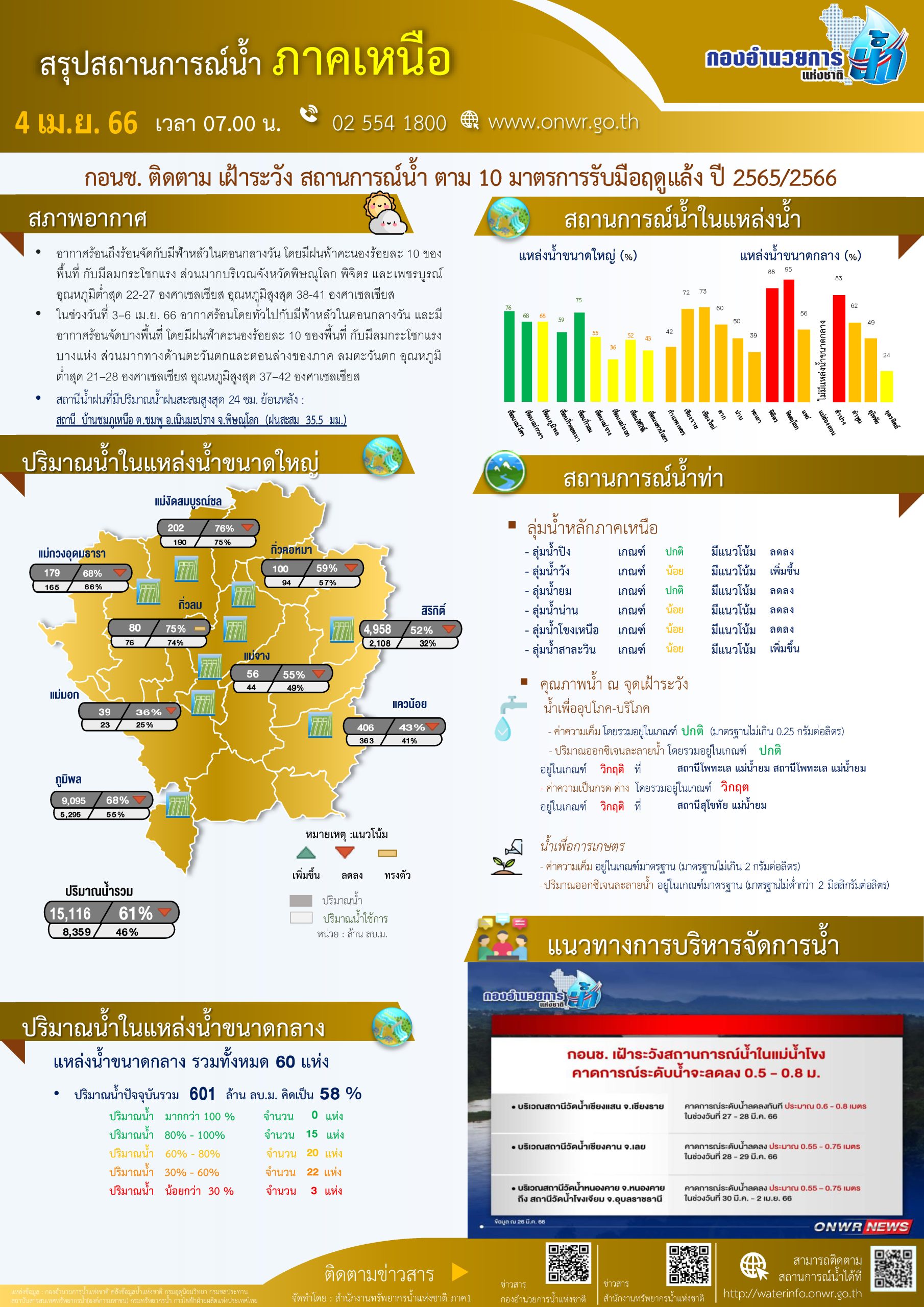 สรุปสถานการณ์น้ำ ภาคเหนือ ประจำวันที่ 4 เมษายน 2566