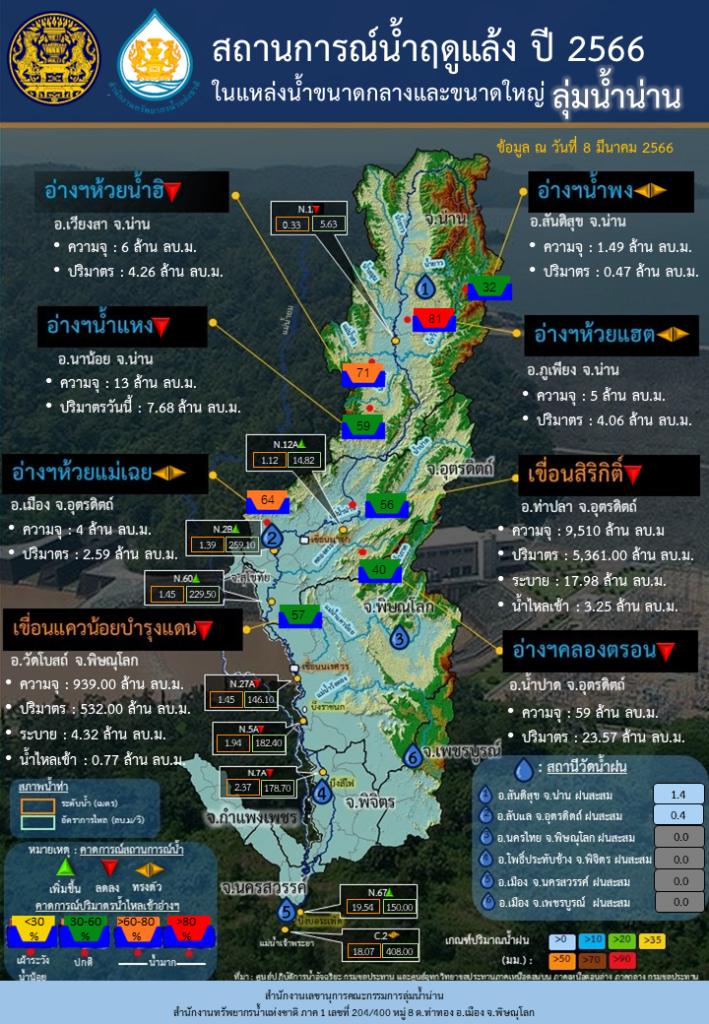 สถานการณ์น้ำฤดูแล้งปี 2566 ในแหล่งน้ำขนาดใหญ่และขนาดกลาง ลุ่มน้ำน่าน ประจำวันที่ 8 มีนาคม 2566
