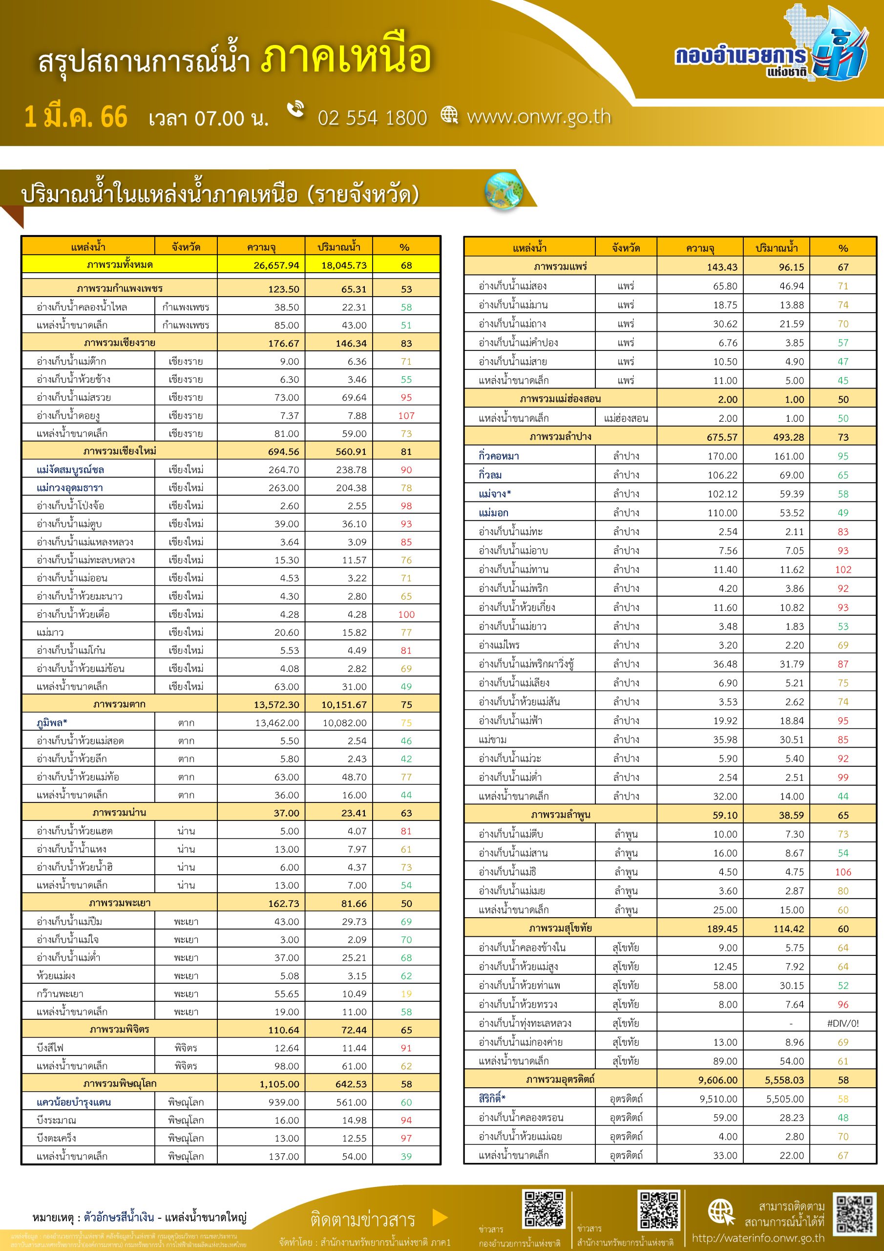 สรุปสถานการณ์น้ำ ภาคเหนือ ประจำวันที่ 1 มีนาคม 2566